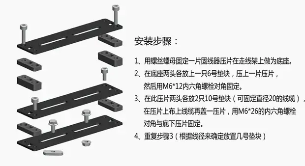 3、 钢塑固线器由钢制压片和阻燃塑料垫块组合而成,根据两端塑料垫片的高低组合,能固定直径6mm-60mm之间的电缆,适合固定各类线径的电源线等。